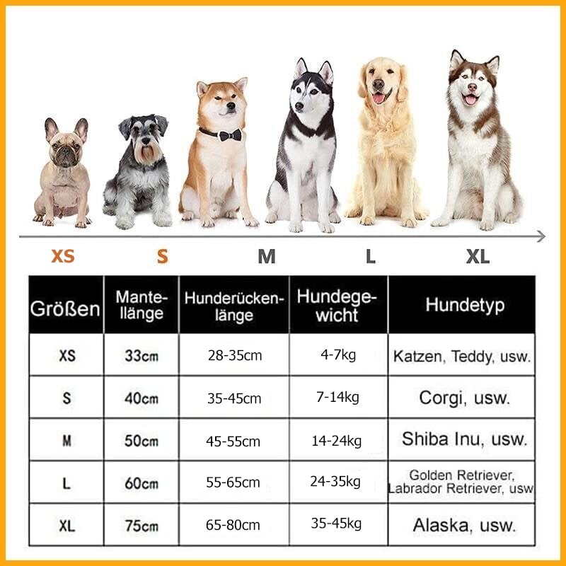 Erhältlich in 5 Größen von XS bis XL, passt er kleinen, mittleren und großen Hunden und Katzen. Die runde Brust und der Hals sind verstellbar, um den Körper des Tieres besser zu bedecken.
