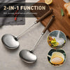 2-IN-1-DESIGN - Der 2-in-1-Pfannenkochlöffel aus Edelstahl kombiniert einen Spatel und einen Löffel für vielseitiges Kochen. Mühelos unter Rühren braten, schöpfen und servieren, was die Zubereitung von Mahlzeiten vereinfacht und Zeit spart – ideal für Suppen, Eintöpfe und mehr.