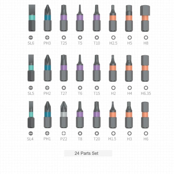 Mehrzweck-Ratschensatz: Dieser Ratschenschraubendreher wird mit 24 unterschiedlich geformten Schraubendreherbits geliefert: Kreuzschlitz (PH1, PH2, PH3); Schlitz (SL4, SL5, SL6); Pozidriv (PZ2); Torx (T5, T6, T8, T10, T15, T20, T25, T27); Sechskant (H1,5, H2, H2,5, H3, H4, H5, H6, H6,35, H8); deckt im Wesentlichen die üblichen Schraubenspezifikationen für die meisten Haushaltsgeräte ab. Und die unterschiedlich farbcodierten Ringe machen es einfach, den richtigen auszuwählen.